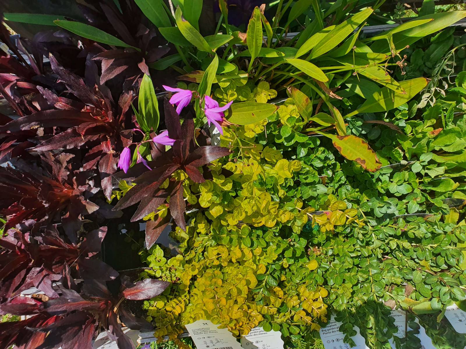 Eté: Iris Versicolor, Pontederia, Lobelia, Hottunia, Mentha Aquatica, Preslia cervina, Thulbagia, Scizirinchium, Zantedeschia Aethiopica (Arum).